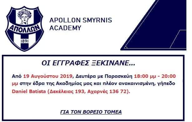 Ανακοινώθηκε η έναρξη των εγγραφών για τις ακαδημίες, του Βορείου Τομέα, της ΠΑΕ Απόλλων Σμύρνης, για την αγωνιστική περίοδο 2019-20.