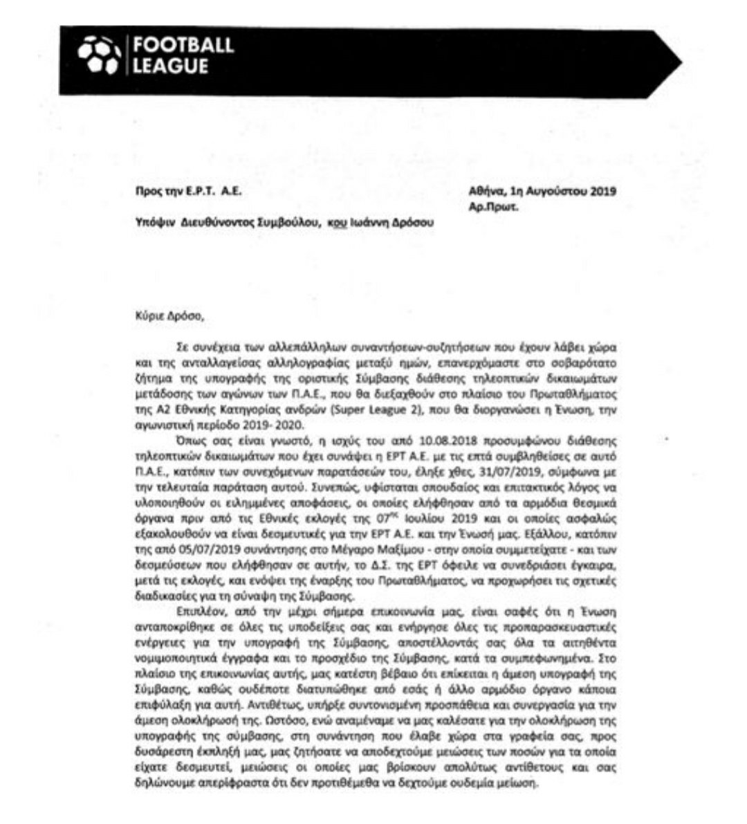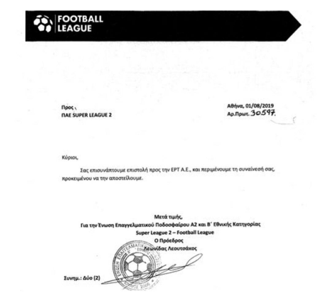 Η σέντρα της Super League 2 βρίσκεται στον αέρα, καθώς το διοικητικό συμβούλιο και οι ΠΑΕ εκφράζουν έντονα τη δυσαρέσκειά τους απέναντι στην ΕΡΤ. «Αγκάθι» στις σχέσεις των δύο πλευρών αποτέλεσε η πρόταση της Δημόσιας Τηλεόρασης για μείωση έως και 60% στα τηλεοπτικά για τη νέα σεζόν. Οι ΠΑΕ και το Δ.Σ. της λίγκας δεν αποδέχτηκαν την εν λόγω πρόταση και καμία άλλη μείωση που θα προταθεί, όπως έχουν αναφέρει. Ο πρόεδρος της SL2, Λεωνίδας Λεουτσάκος, απέστειλε επιστολή στην ΕΡΤ, την οποία μπορείτε να βρείτε παρακάτω: