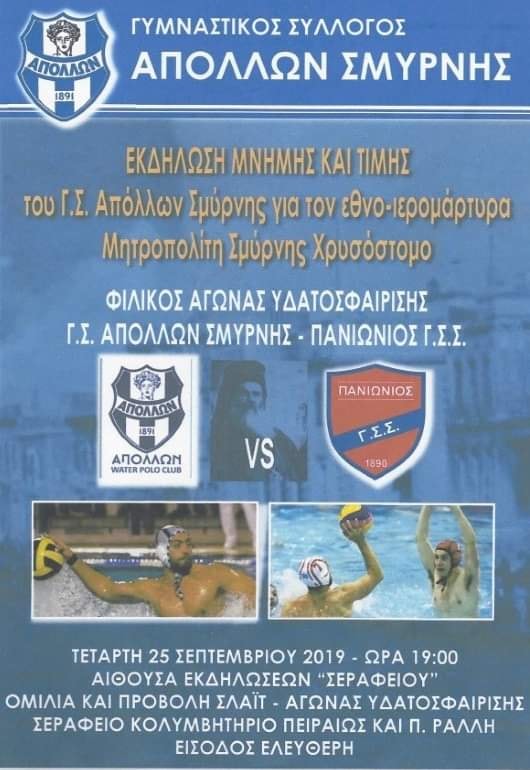Φιλικό προς τιμήν του εθνο-ιερομάρτυρα Μητροπολίτη Σμύρνης Χρυσόστομου, θα δώσουν τα τμήματα υδατοσφαίρισης του Απόλλωνα και του Πανιωνίου!