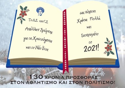 «Ο πρόεδρος και το Δ.Σ. του Γ.Σ. Απόλλων Σμύρνης, εύχονται ολόψυχα στα μέλη του Συλλόγου, τους εν ενεργεία και παλαίμαχους αθλητές, στην ΠΑΕ Απόλλων Σμύρνης και τους ποδοσφαιριστές της, στους αθλητές όλων των τμημάτων μας και τους γονείς τους, στις Αθλητικές Αρχές και Ομοσπονδίες, στις Δημοτικές Αρχές και σε όλους τους φίλους και τους φιλάθλους μας,