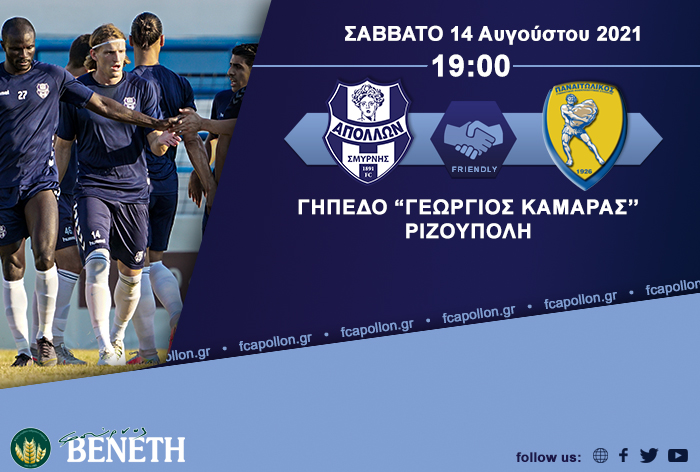 «Ένα ακόμα φιλικό τεστ είναι προγραμματισμένο για τον Απόλλωνα Σμύρνης, το Σάββατο, 14/8/2021. Αντίπαλος της ομάδας μας θα είναι ο Παναιτωλικός. Ο αγώνας είναι προπονητικού χαρακτήρα και θα διεξαχθεί στο γήπεδο «Γεώργιος Καμάρας», χωρίς την παρουσία φιλάθλων. Θα αρχίσει στις 19:00.