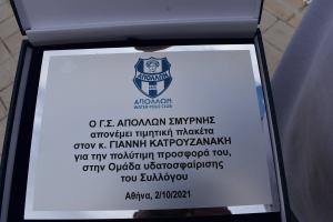Πριν την έναρξη της αναμέτρησης, ο ΓΣ Απόλλων αλλά και οι οργανωμένοι οπαδοί της «Ελαφράς Ταξιαρχίας», οι Basso Rango, βράβευσαν τον Γιάννη Κατρουζανάκη και τον Στάθη Παπαγεωργίου. Αμφότεροι βρίσκονται, πλέον, στον ΑΝΟΓ έχοντας ωστόσο πολύτιμη προϋπηρεσία και προσφορά στον Απόλλωνα! Ως γνωστόν ο Γιάννης Κατρουζανάκης διετέλεσε έναν χρόνο ως παίκτης και τέσσερα ως προπονητής στους «Kυανόλευκους», ενώ ο Στάθης Παπαγεωργίου ήταν στην ομάδα μας για τρία χρόνια, από το καλοκαίρι του 2018 έως το καλοκαίρι που μας πέρασε. Ο ΓΣ Απόλλων θέλησε να τιμήσει και να ευχαριστήσει με αυτήν την κίνηση αμφότερους με τον έφορο της ομάδας, Σπύρο Μίντζη, να παραδίδει τιμητική πλακέτα και από μία ανθοδέσμη και στους δύο. Επίσης, αντιπροσωπεία των Basso Rango θέλησε, εκ μέρους όλων των οργανωμένων φιλάθλων, να πει κι εκείνη το «ευχαριστώ» για όλα τα προηγούμενα επιτυχημένα χρόνια δίνοντας τους από μία ανθοδέσμη, με την ατάκα του Στάθη Παπαγεωργίου «δεν έχω πάρει ποτέ τόσα λουλούδια» να ξεχωρίζει!