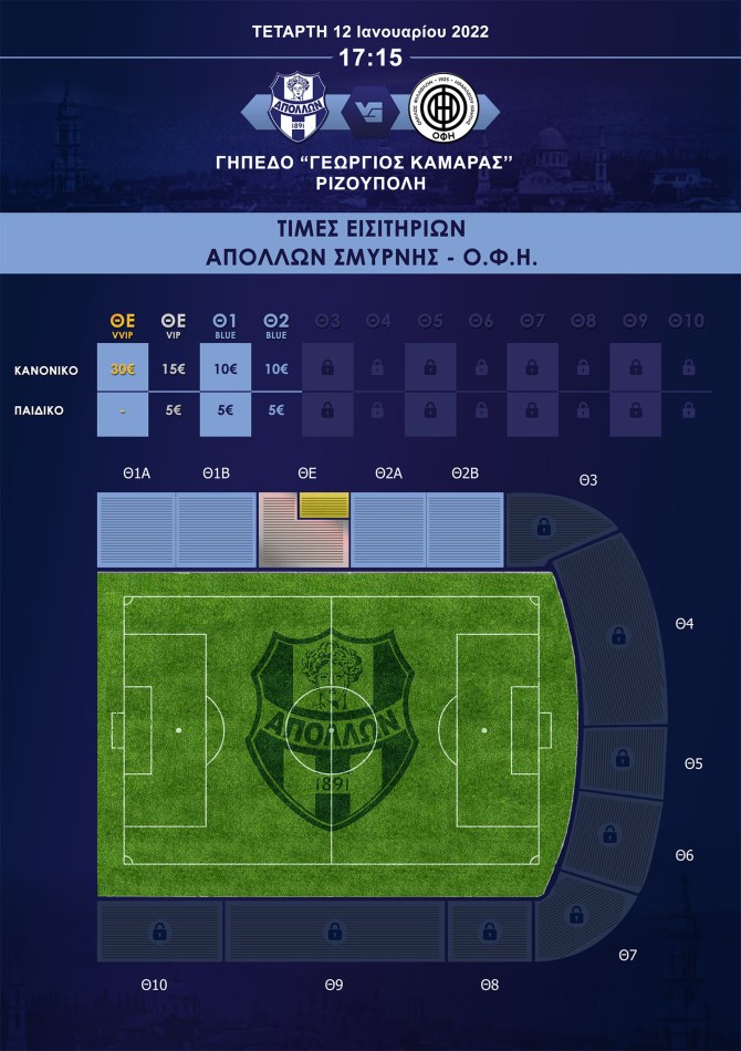«Για τη διευκόλυνση όσων θέλουν να παρακολουθήσουν τον εξ αναβολής εντός έδρας αγώνα της ομάδας μας με αντίπαλο τον Ο.Φ.Η. (Τετάρτη, 12/01/2022, 17:15) για τη 13η αγωνιστική ημέρα του πρωταθλήματος της Super League Interwetten, στο γήπεδο «Γεώργιος Καμάρας», η ΠΑΕ Απόλλων Σμύρνης ενημερώνει: