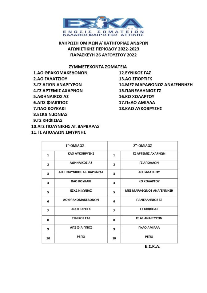 Ανακοινώθηκαν οι όμιλοι για την Α’ ΕΣΚΑ της σεζόν 2022/23.