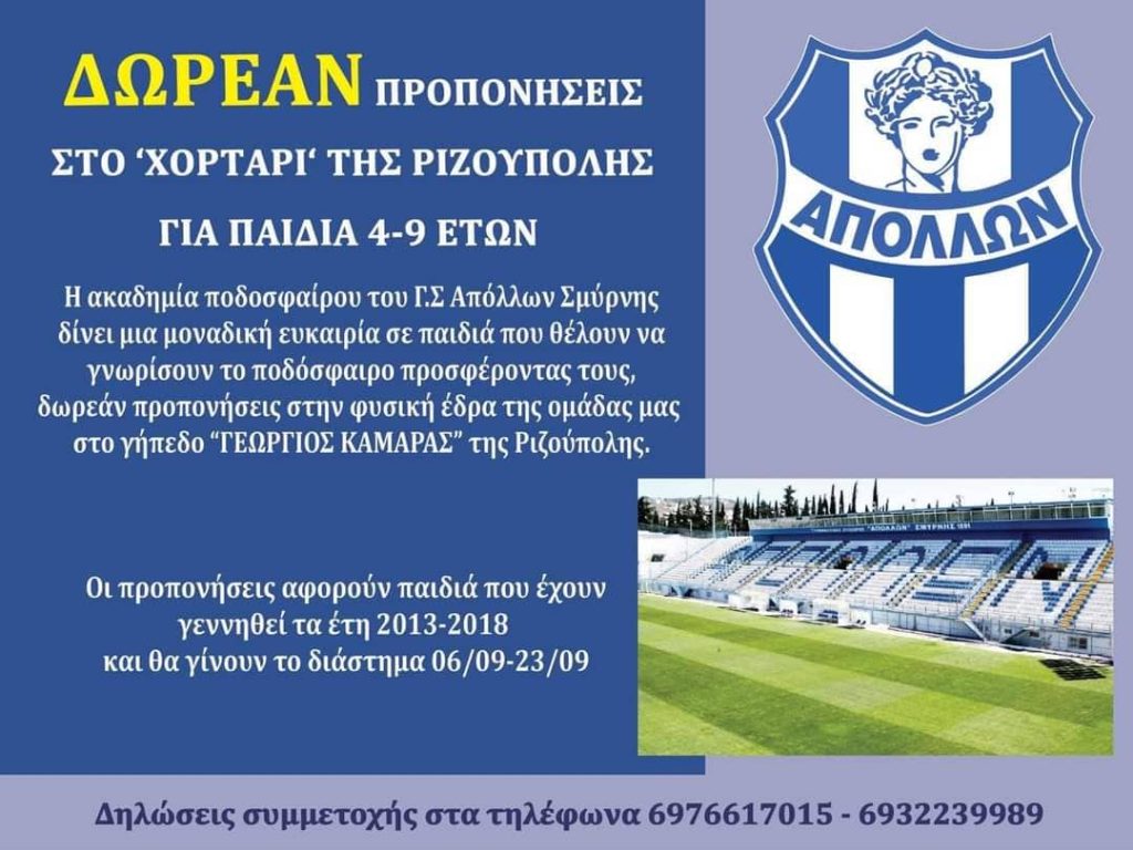 Από 6 ως 23 Σεπτεμβρίου η ακαδημία ποδοσφαίρου του ΓΣ Απόλλων δίνει την ευκαιρία σε παιδιά από 4 ετών μέχρι 9 ετών να προπονηθούνε δωρεάν στη Ριζούπολη και να ζήσουν «κλίμα γηπέδου» στο χορτάρι της «Ελαφράς Ταξιαρχίας». 6976617015 και 6932239989 τα τηλέφωνα επικοινωνίας όπου μπορούν οι ενδιαφερόμενοι γονείς να έρθουν σε επαφή με τους ιθύνοντες.