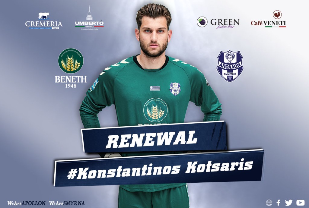«Η ΠΑΕ Απόλλων Σμύρνης ανακοινώνει την υπογραφή νέου συμβολαίου με τον τερματοφύλακα Κωνσταντίνο Κότσαρη. Γεννημένος στις 25 Ιουλίου 1996, αγωνίστηκε στην ομάδα μας από το καλοκαίρι του 2020 έως το τέλος του περασμένου πρωταθλήματος οπότε και έληξε το συμβόλαιό του. Θα συνεχίσει να αγωνίζεται στον Απόλλωνα ενώ στο παρελθόν έχει παίξει σε Παναθηναϊκό, Ομόνοια και Αήττητο Σπατών. Υπήρξε διεθνής με την Εθνική ομάδα των Ελπίδων και τις μικρότερες ηλικιακά Εθνικές ομάδες.»