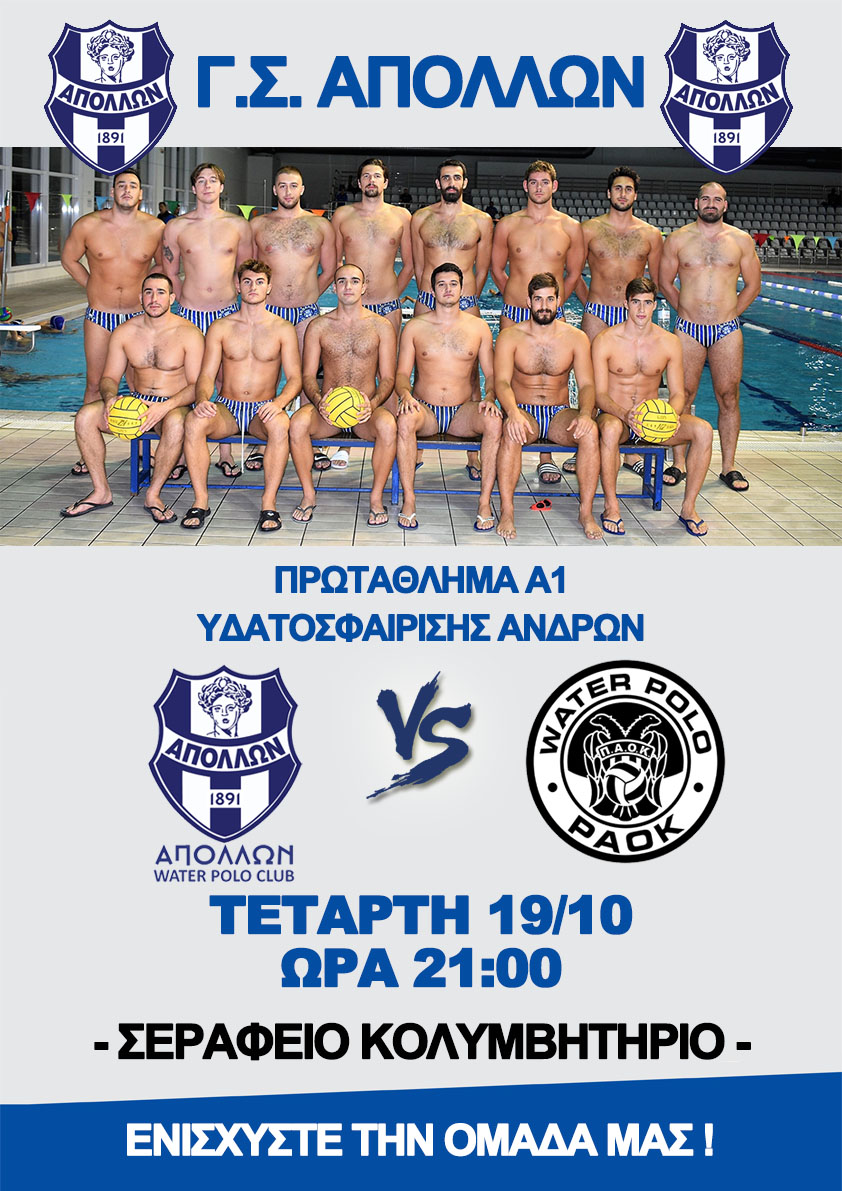 «Τον πρώτο εντός έδρας αγώνα της σεζόν δίνει αύριο (19/10) το βράδυ στις 21:00 ο ΓΣ Απόλλων Σμύρνης, ο οποίος υποδέχεται στο Σεράφειο κολυμβητήριο τον ΠΑΟΚ στο πλαίσιο της 2ης αγωνιστικής του Β’ Ομίλου της Α1 Υδατοσφαίρισης των Ανδρών.