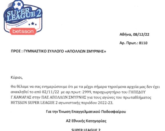 Η SuperLeague 2 επιβεβαίωσε με έγγραφο της προς τον ΓΣ Απόλλων ότι δεν έχει ανακληθεί το παραχωρητήριου του γηπέδου της Ριζούπολης.