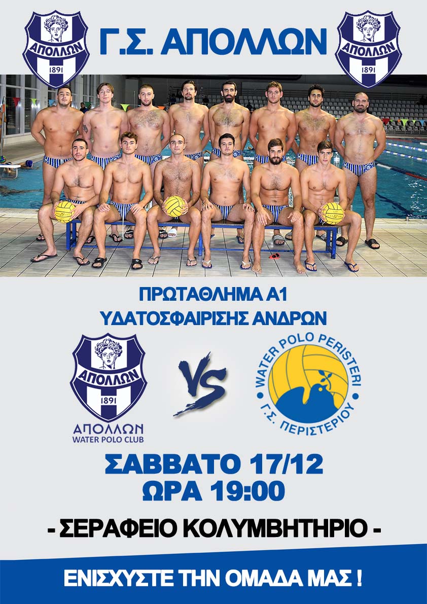 «Τον ΓΣ Περιστερίου υποδέχεται μεθαύριο Σάββατο (17/12) στις 19:00 στο Σεράφειο Κολυμβητήριο ο ΓΣ Απόλλων Σμύρνης στο πλαίσιο της 12ης αγωνιστικής του Β’ Ομίλου της Α1 των Ανδρών.