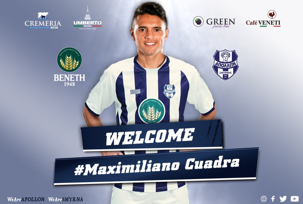 «Η ΠΑΕ Απόλλων Σμύρνης ανακοινώνει την απόκτηση του ποδοσφαιριστή Μαξιμιλιάνο Πάμπλο Κουάδρα. Γεννημένος στις 6 Ιουνίου 1995 στην Αργεντινή αγωνίζεται ως επιθετικός. Στο παρελθόν έχει παίξει στην Αργεντινή σε Ρασίνγκ Κλουμπ, Ουνιόν Σάντα Φε, Χιμνάσια Λα Πλάτα και Μπάνφιλντ και στη Χιλή σε Κομπρελόα και Σαν Λουίς ντε Κιγιότα.»