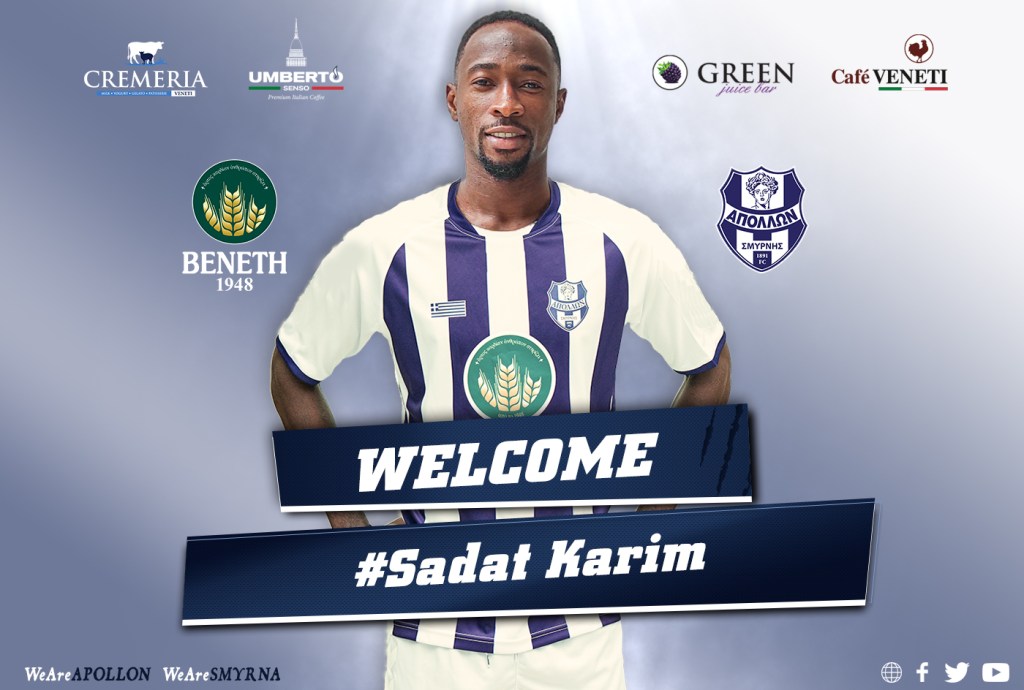 «Η ΠΑΕ Απόλλων Σμύρνης ανακοινώνει την απόκτηση του ποδοσφαιριστή Σαντάτ Καρίμ. Γεννημένος στις 24 Οκτωβρίου 1991 στη Γκάνα αγωνίζεται ως επιθετικός. Τελευταία του ομάδα είναι η Σουηδική Χάλμσταντ ενώ στο παρελθόν έχει παίξει στις Λαντσκρόνα, Πρέσπα Μπίρλικ στη Σουηδία και στις Χαρτς οφ Όουκ, Μπερεκούμ Τσέλσι, Ασάντι Γκολντ, Ρεάλ Ταμάλε Γιουνάιτεντ στη Γκάνα.»