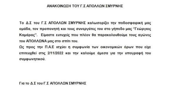 Η ανακοίνωση του ΓΣ Απόλλων: