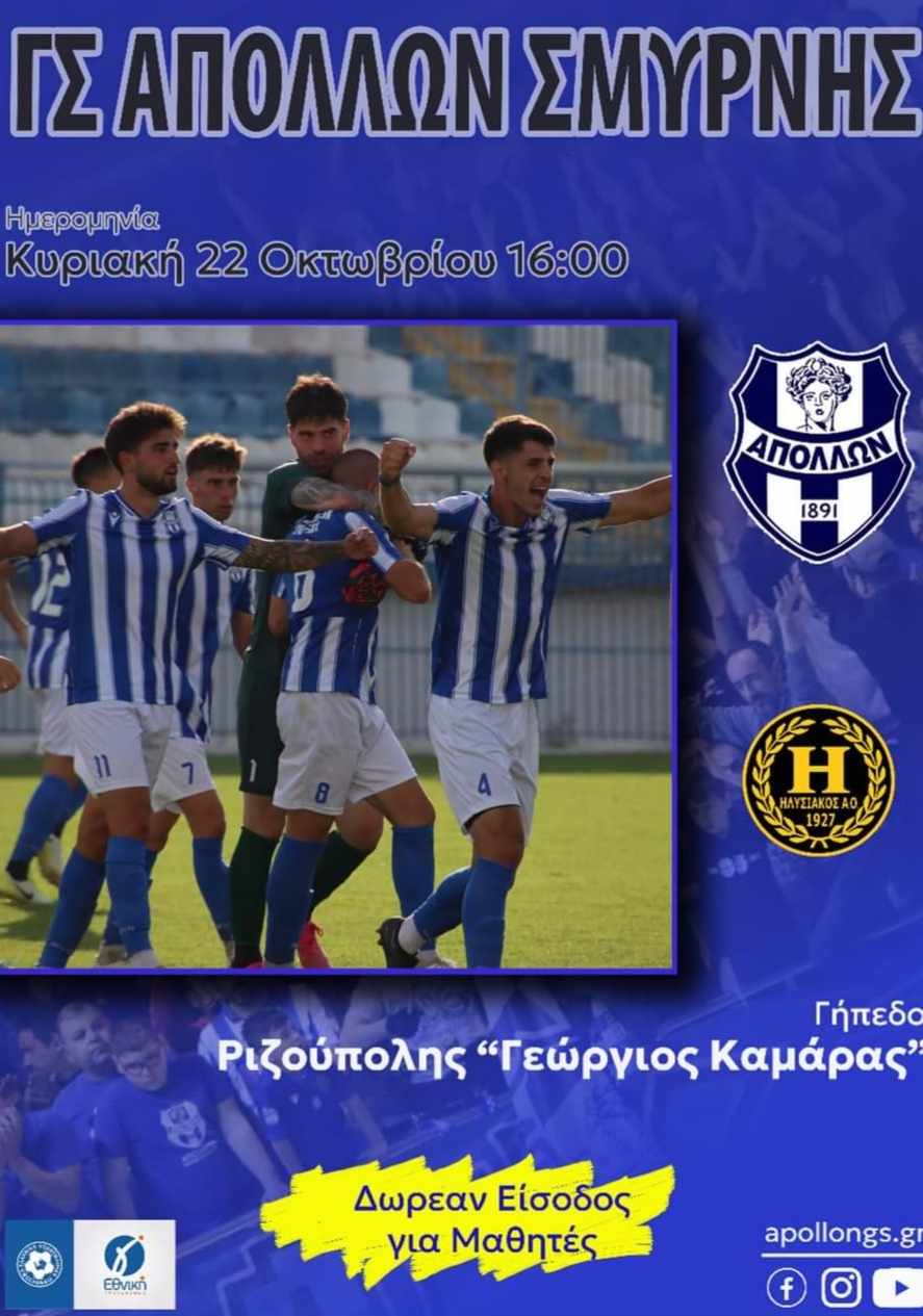 «Ο Γ.Σ. Απόλλων Σμύρνης αντιμετωπίζει την Κυριακή 22/10/23 και ώρα 16:00, στο γήπεδο της Ριζούπολης «Γεώργιος Καμάρας», την ομάδα του Ηλυσιακού, για το πρωτάθλημα ποδοσφαίρου της Γ’ Εθνικής.