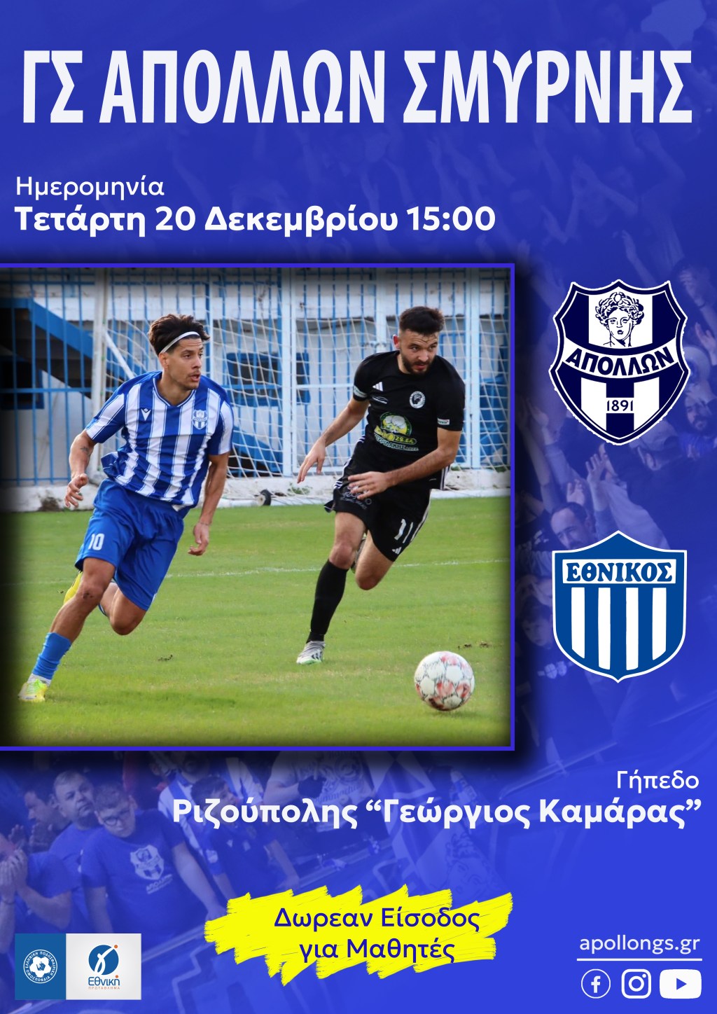 «Ο Γ.Σ. Απόλλων Σμύρνης αντιμετωπίζει την ΤΕΤΑΡΤΗ 20/12 και ώρα 15:00, στο γήπεδο της Ριζούπολης «Γ. ΚΑΜΑΡΑΣ», τον Εθνικό Πειραιά, στο τελευταίο παιχνίδι του 2023, για το Πρωτάθλημα Ελλάδος της Γ’ Εθνικής.