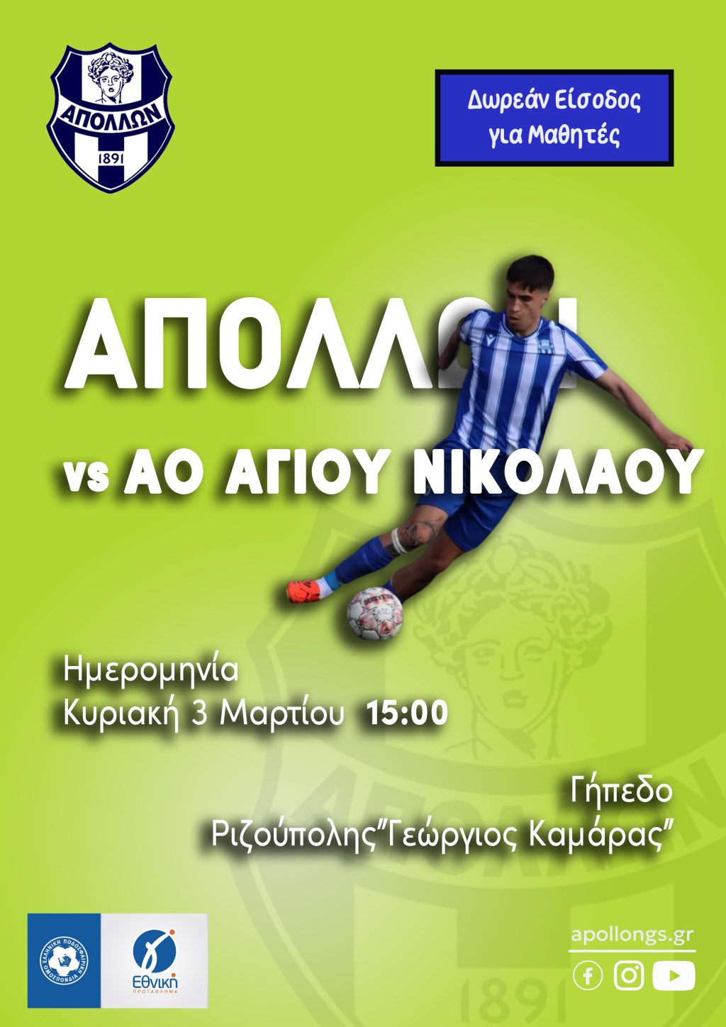 Ανακοίνωση-Κάλεσμα αναφορικά με την αναμέτρηση με τον Άγιο Νικόλαο εξέδωσε ο ΓΣ Απόλλων.