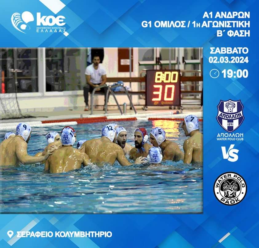 Αύριο στις 19:00 υποδέχεται στο Σεράφειο Κολυμβητήριο τον ΠΑΟΚ στο πλαίσιο της 1ης αγωνιστικής του Γκρουπ 1 για τη Β’ Φάση της Α1 Υδατοσφαίρισης των Ανδρών.