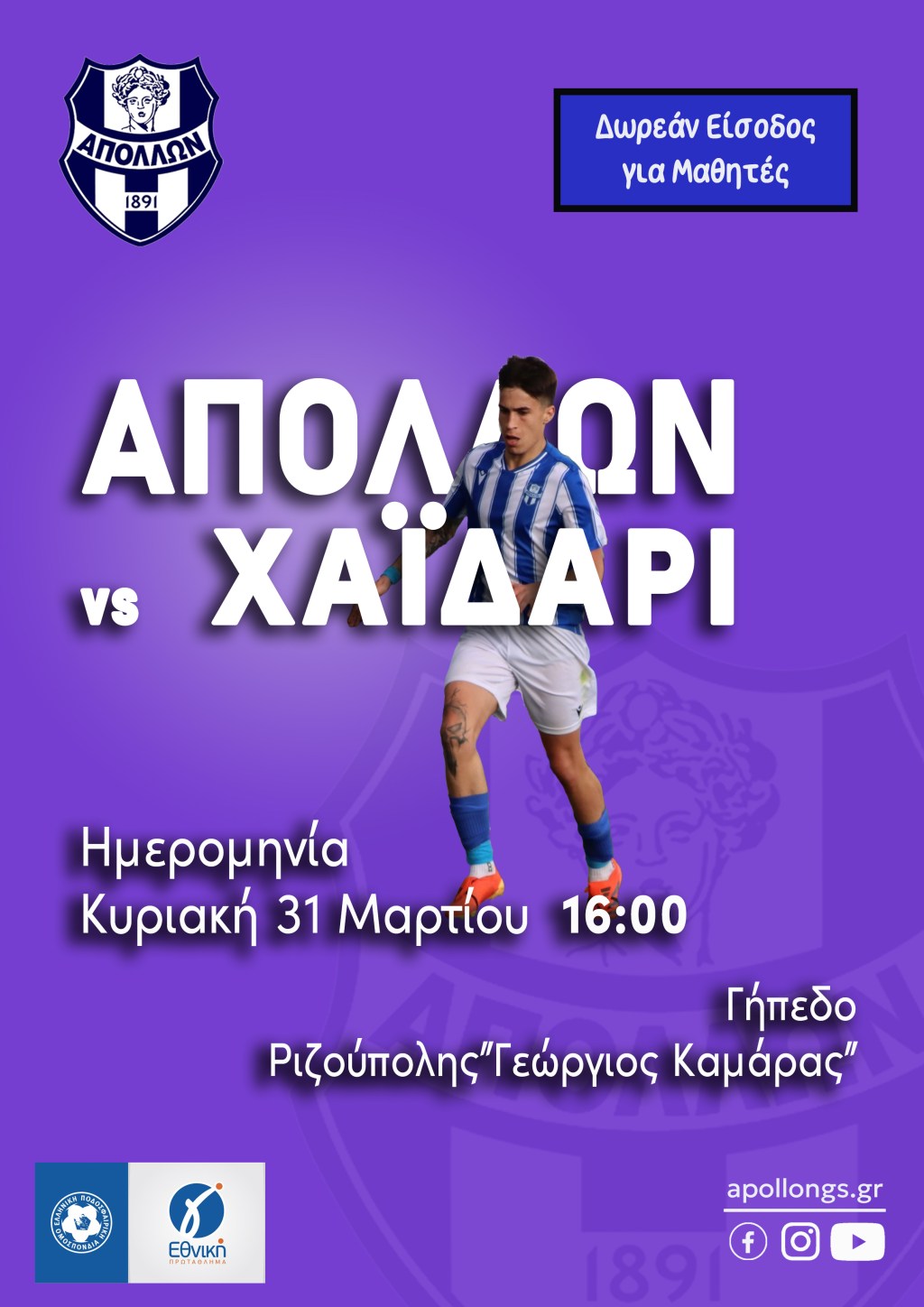 Ανακοίνωση-Κάλεσμα εξέδωσε ο ΓΣ Απόλλων αναφορικά με την αναμέτρηση κόντρα στον ΑΟ Χαϊδαρίου.