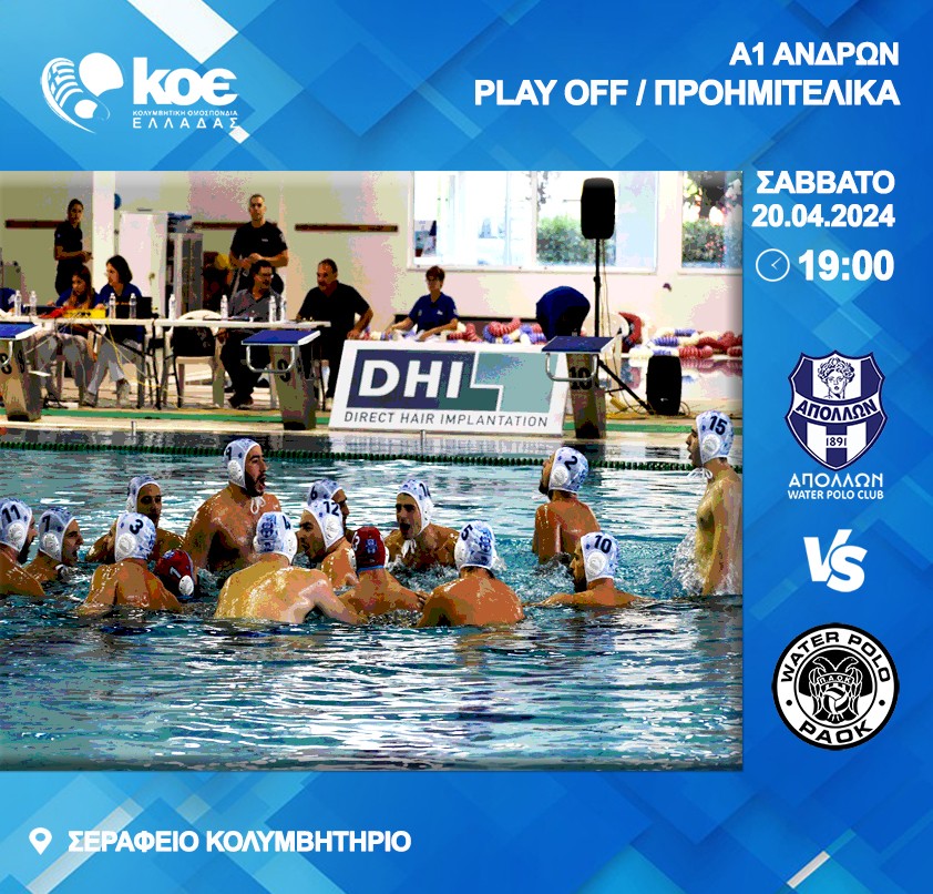 Αύριο (20/4) στις 19:00 στο Σεράφειο κολυμβητήριο ο ΓΣ Απόλλων Σμύρνης υποδέχεται τον ΠΑΟΚ στον 1ο μεταξύ τους Προημιτελικό της Α1 των Ανδρών με… φόντο την είσοδο στα Ημιτελικά και την εξασφάλιση ευρωπαϊκού εισιτηρίου για τη σεζόν 2024-2025!