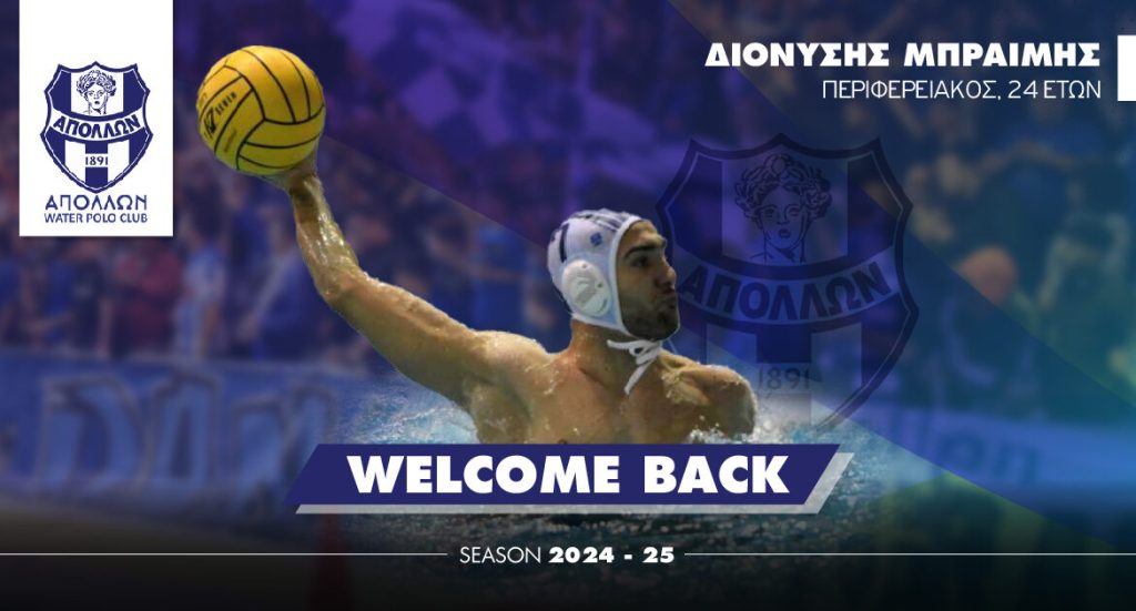 Ο 24χρονος περιφερειακός, μετά από διάλειμμα ενός έτους επιστρέφει… εκεί όπου αγάπησε και αγαπήθηκε! Αγωνίστηκε στην «ελαφρά ταξιαρχία» τη χρυσή σεζόν της κατάκτησης του LEN Challenger Cup (2022-2023) έχοντας καθοριστική συμβολή στη μεγάλη αυτή πορεία, αναπτύσσοντας, παράλληλα, ισχυρούς και αμφίδρομους δεσμούς αγάπης με το σωματείο, τον κόσμο και όλους στην ομάδα. Κανείς εξάλλου δεν μπορεί να ξεχάσει την εικόνα του Διονύση Μπραΐμη να αναλαμβάνει ρόλο οργανωτή στην εξέδρα μετά τον θρίαμβο στην Τεράσα με την ντουντούκα στα χέρια και σχεδόν αγκαλιά με τους Απολλωνιστές φιλάθλους!