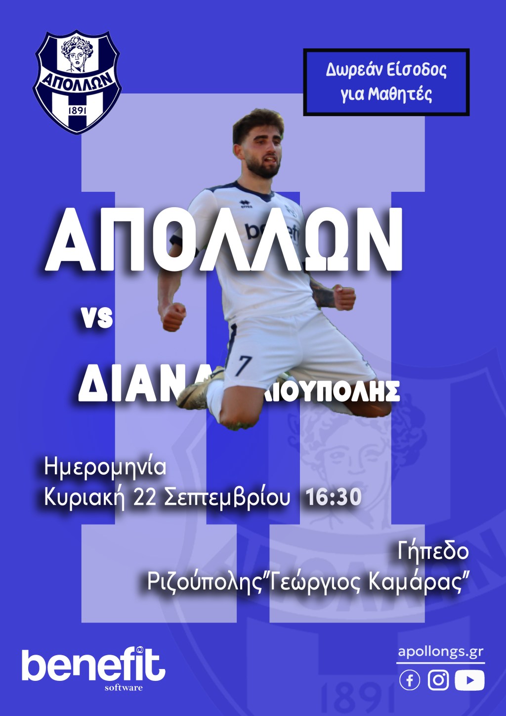 «Αυτή την Κυριακή 22/9 στις 4:30 μ.μ. , ο Γ.Σ. Απόλλων Σμύρνης αντιμετωπίζει στο γήπεδο της Ριζούπολης «Γ. ΚΑΜΑΡΑΣ», την ομάδα Διάνα Ηλιούπολης.
