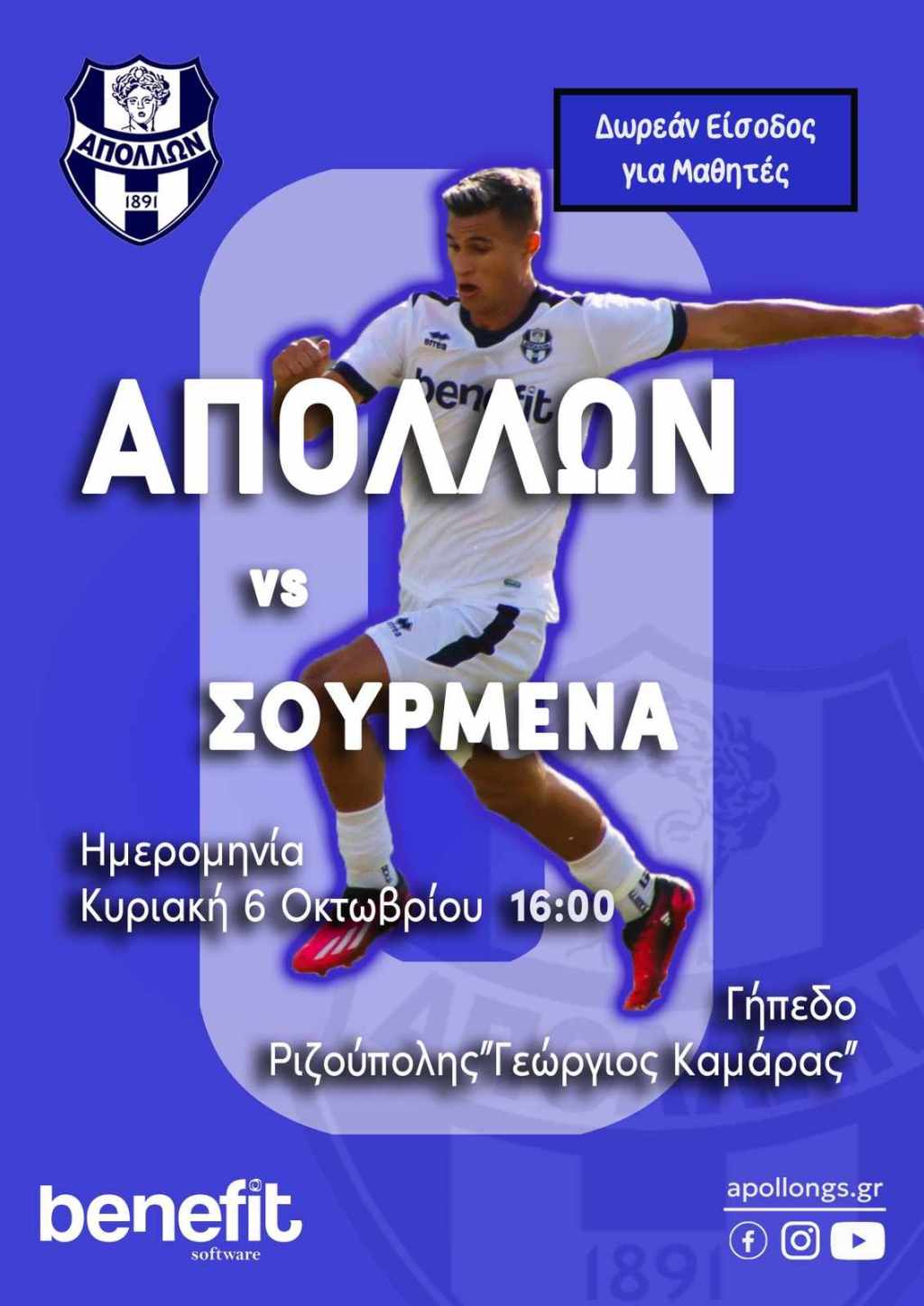 Την Κυριακή 6 Οκτωβρίου στις 4:00 μ.μ. , ο Γ.Σ. Απόλλων Σμύρνης αντιμετωπίζει στο γήπεδο της Ριζούπολης «Γ. ΚΑΜΑΡΑΣ», την ομάδα των Σουρμένων, και όπως πάντα οι μαθητές Δημοτικού, Γυμνασίου και Λυκείου, θα εισέρχονται στο γήπεδο δωρεάν.