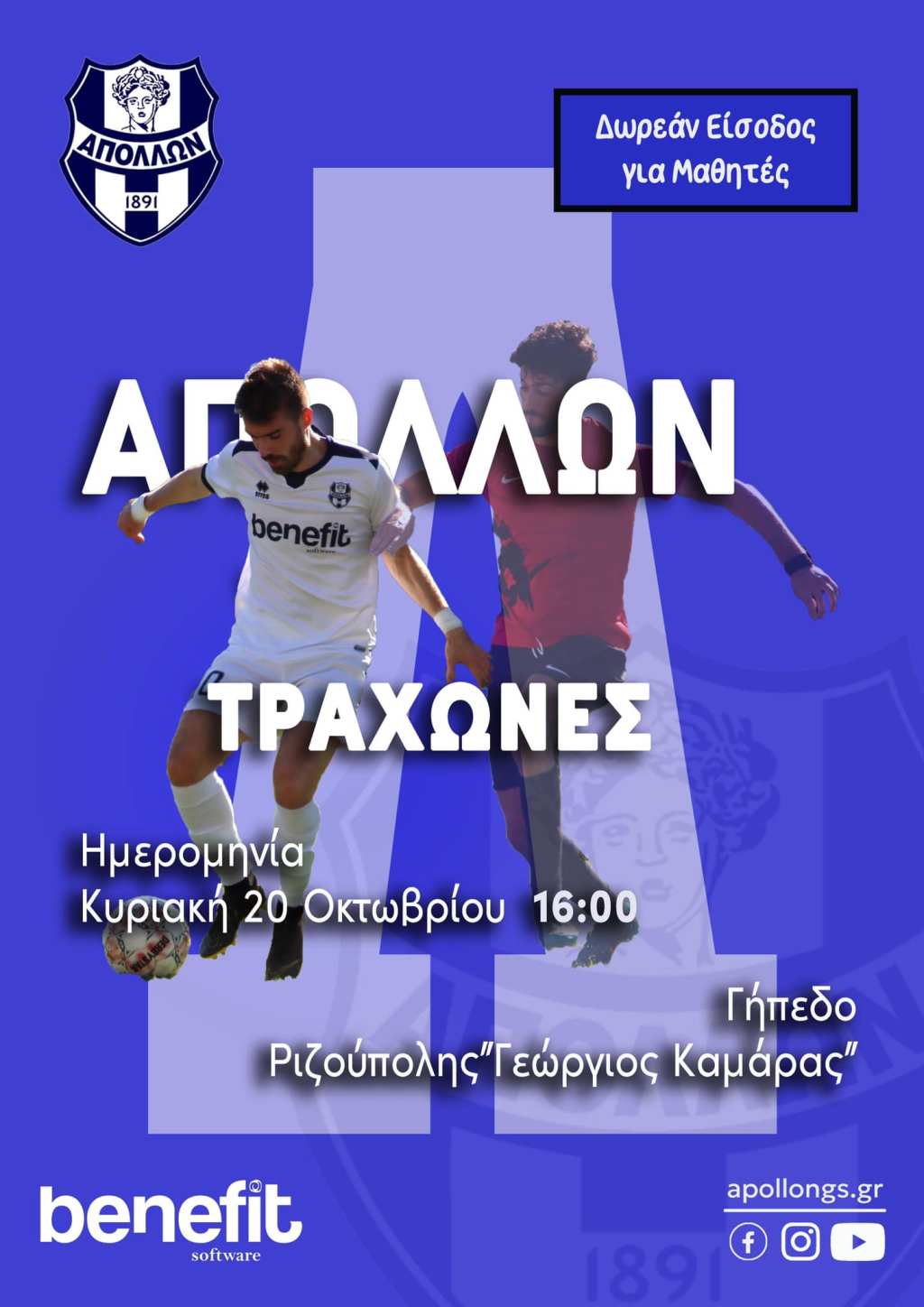 «Την Κυριακή 20 Οκτωβρίου στις 4:00 μ.μ., ο Γ.Σ. Απόλλων Σμύρνης αντιμετωπίζει στο γήπεδο της Ριζούπολης «Γ. ΚΑΜΑΡΑΣ»,την ομάδα Τράχωνες, και όπως πάντα οι μαθητές Δημοτικού, Γυμνασίου και Λυκείου, θα μπορούν να δουν τον αγώνα δωρεάν.