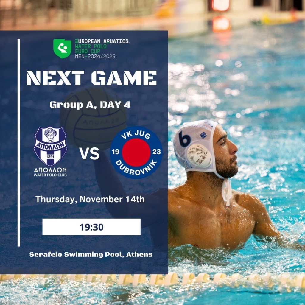 Ο Απόλλων, που στον πρώτο αγώνα στο Ντουμπρόβνικ είχε ηττηθεί με 14-10, θα επιδιώξει να φτάσει στην κατάκτηση των πρώτων του βαθμών στον όμιλο και να… εξαντλήσει στη συνέχεια τις πιθανότητες για πλασάρισμα στις δύο πρώτες θέσεις της κατάταξης, που δίνουν και το εισιτήριο για την επόμενη φάση.