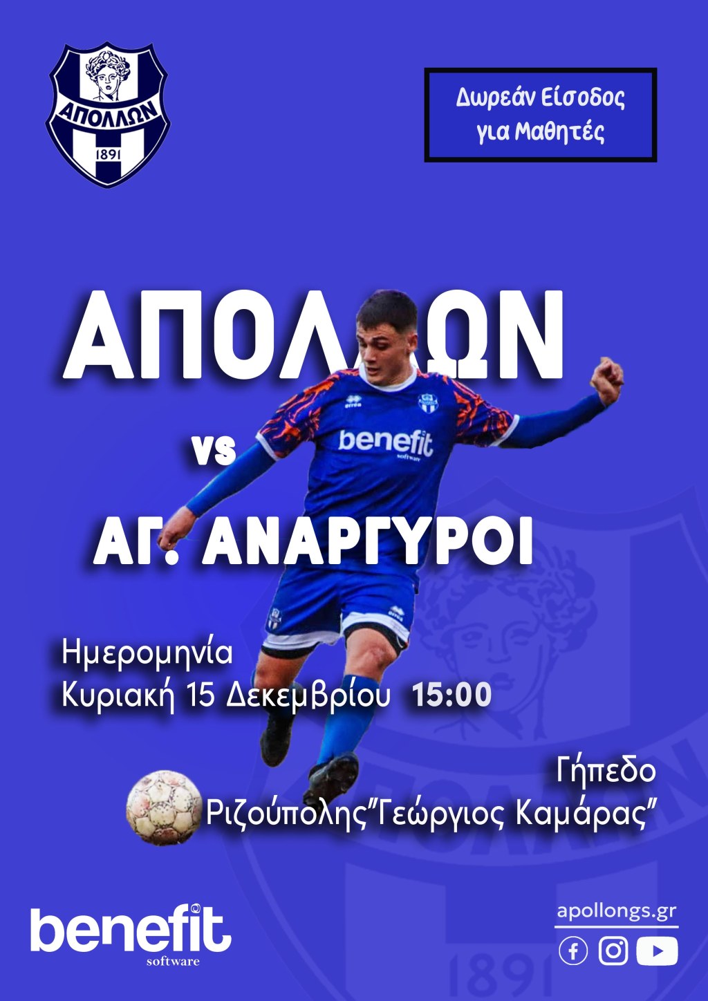 «Την Κυριακή 15 Δεκεμβρίου στις 3:00 μ.μ., ο Απόλλων Σμύρνης αντιμετωπίζει στο γήπεδο της Ριζούπολης «Γ. ΚΑΜΑΡΑΣ», την ομάδα Άγιοι Ανάργυροι, και όπως πάντα οι μαθητές Δημοτικού, Γυμνασίου και Λυκείου, θα μπορούν να δουν τον αγώνα δωρεάν.