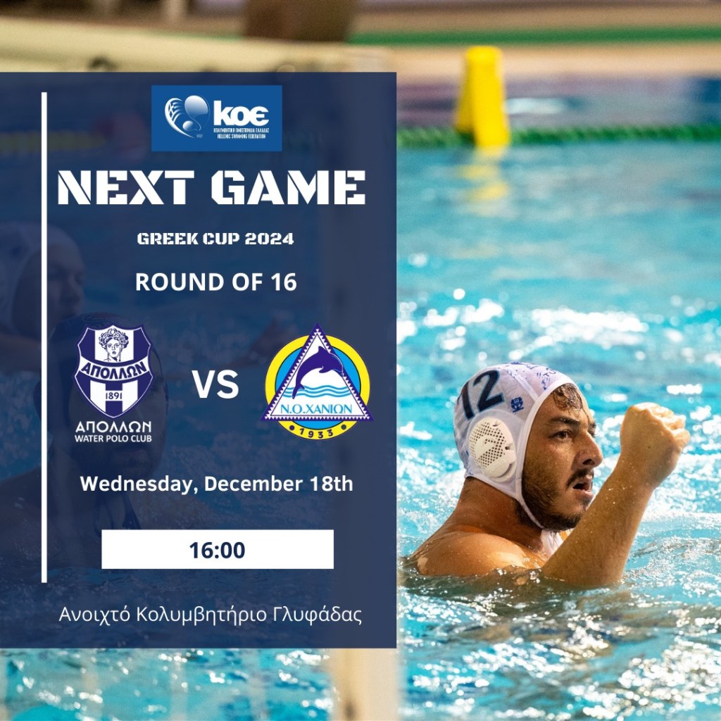 ««Αυλαία» στο Κύπελλο Ελλάδας για τον Απόλλωνα Σμύρνης, που αύριο (18/12) στις 16:00 υποδέχεται ως γηπεδούχος στο ανοικτό κολυμβητήριο Γλυφάδας τον ΝΟ Χανίων σε νοκ άουτ αναμέτρηση για τη φάση των «16» της διοργάνωσης.
