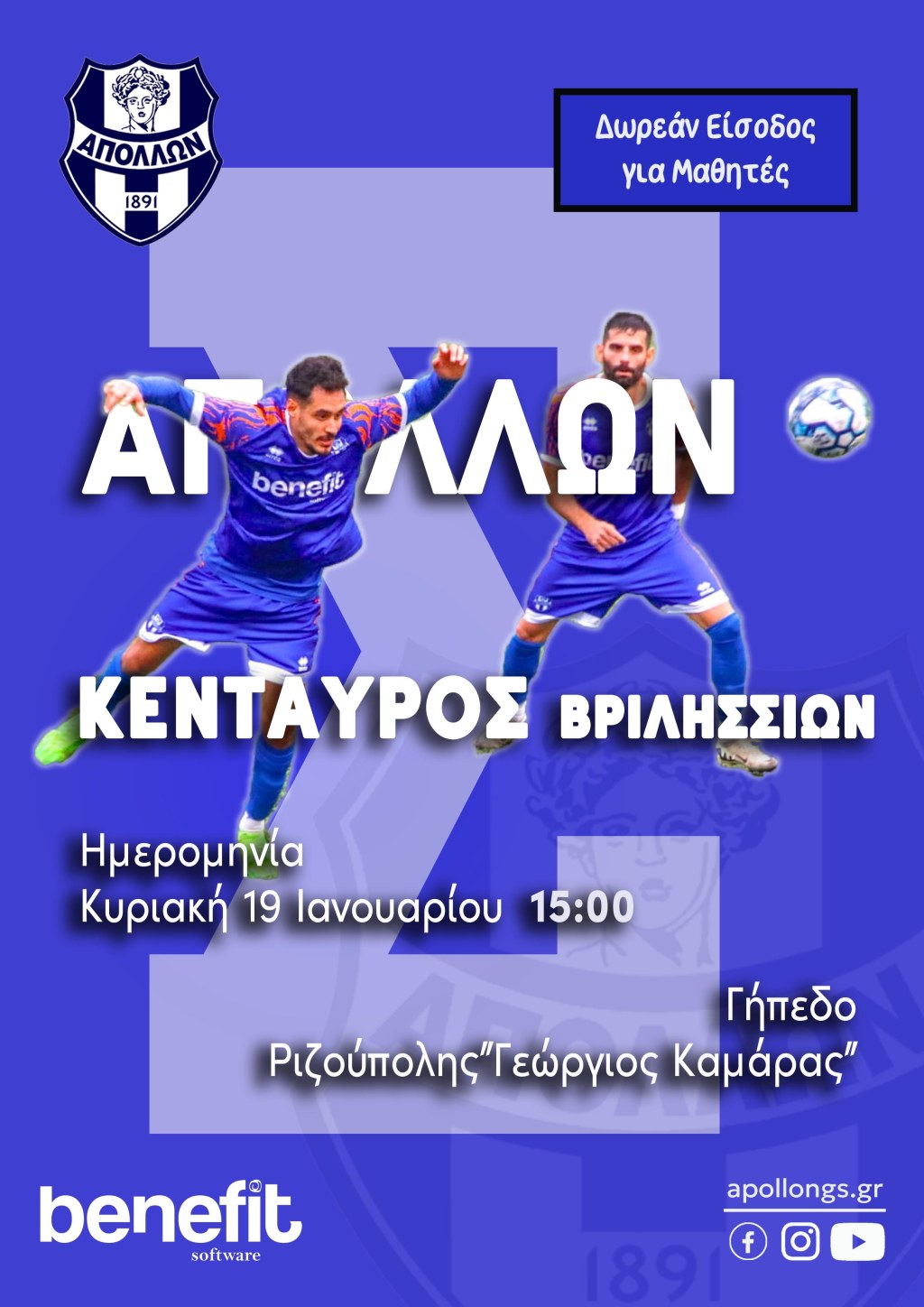 «Την Κυριακή 19 Ιανουαρίου στις 3:00 μ.μ., ο Απόλλωνας Γ.Σ.Σ. αντιμετωπίζει στο γήπεδο της Ριζούπολης «Γ. ΚΑΜΑΡΑΣ»,την ομάδα «Κένταυρος Βριλησσίων» και όπως πάντα οι μαθητές Δημοτικού, Γυμνασίου και Λυκείου, θα μπορούν να δουν τον αγώνα ΔΩΡΕΑΝ.