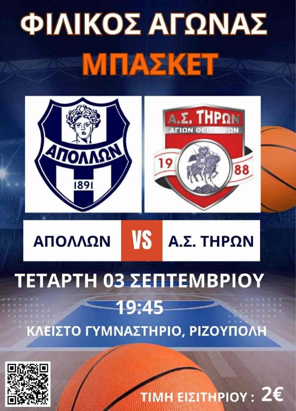 Ο Απόλλων Σμύρνης θα αντιμετωπίσει τον ΑΣ Τηρών Αγίων Θεοδώρων σε φιλική αναμέτρηση στο κλειστό Γυμναστήριο της Ριζούπολης.