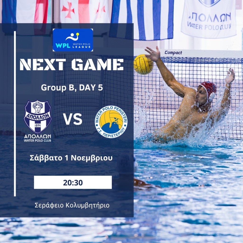 «Αγωνιστικών υποχρεώσεων συνέχεια για τον Απόλλωνα Σμύρνης, που το προσεχές Σάββατο (1/11) υποδέχεται στις 20:30 στο Σεράφειο κολυμβητήριο τον ΓΣ Περιστερίου για την 5η αγωνιστική του Β’ Ομίλου της Waterpolo League.