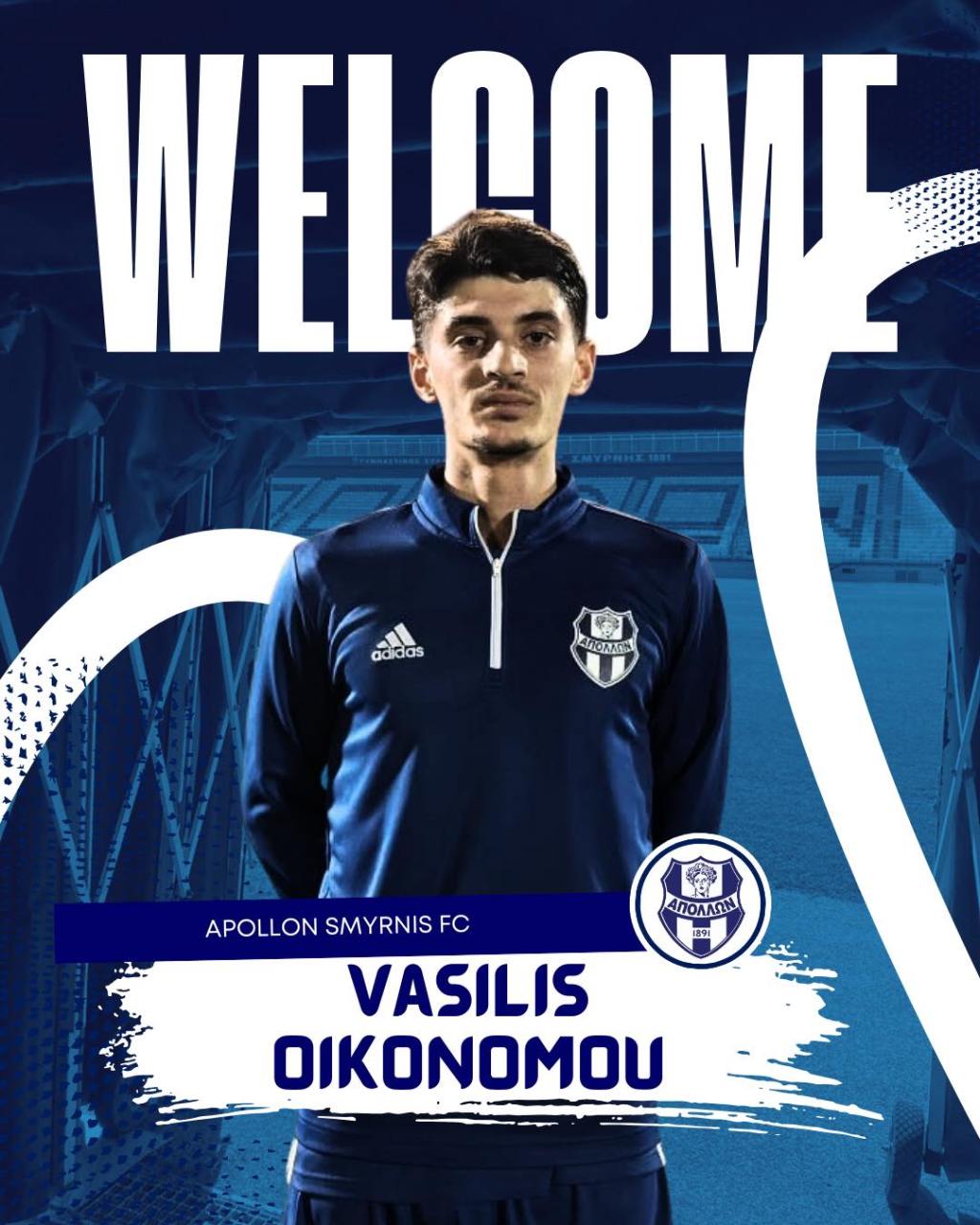 «Ο Απόλλων Σμύρνης ανακοινώνει την απόκτηση του Βασίλη Οικονόμου. Ο 23χρονος επιθετικός ήταν ελεύθερος από τον Ηρακλή Περιστερίου, ενώ έχει αγωνιστεί με επιτυχία σε Πέλοπα Κιάτου, Αχαρναικό και Φοίνικα Νέας Επιδαύρου.