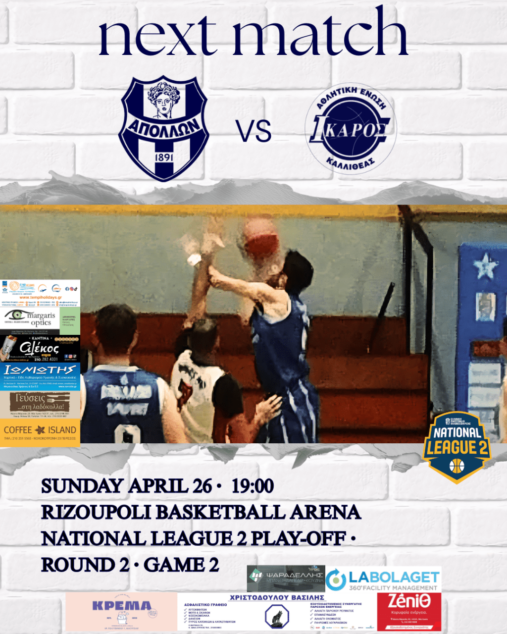 «Την Κυριακή 26 Απριλίου ο Απόλλων Σμύρνης φιλοξενεί την ΑΕ Ίκαρος Καλλιθέας στο κλειστό της Ριζούπολης για την 2η αγωνιστική των ημιτελικών των πλέι-οφ της National League 2.